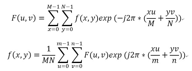 f(x, y) 是时域函数,x、y表示图像点的空间位置;F(u, v) 是频域函数,u、v表示频域点的图像表示时的空间位置;M、N 和m、n 分别表示图像的尺寸。对于图像的傅里叶变换,就是一个二维离散傅里叶变换,它利用一个域平面上的每一点来生成另一个域上某个点的信息。而对于f和F并不需要符合一个连续的公式,只需要对每个离散的f(x, y) 和F(u, v) 变换的值进行累加即可。