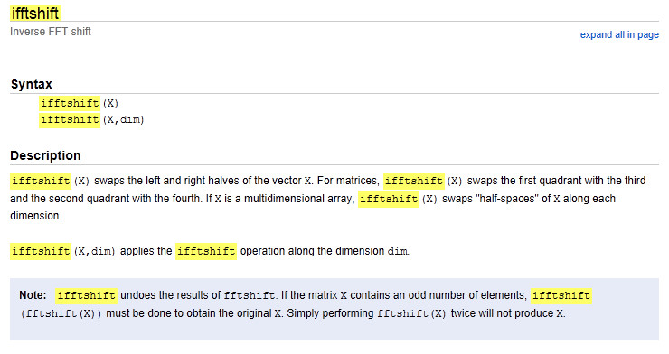这两个结论在MATLAB的help文档中都有很好的描述,在学习编程和这些函数操作的时候,在下非常鼓励大家仔细的阅读文档,读懂文档可以省去很多如上罗列的粗糙的验证过程,在文档说明不明确的时候再设计小实验验证,补全自己不完整的思考。在下在这里搬运出来fftshift和ifftshift的文档如下: