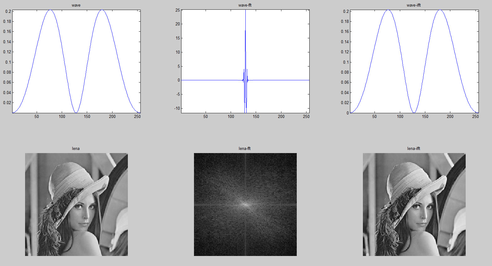我们在这里可以设计一段程序来做实验,验证在傅里叶变换中经过正变换和逆变换之后仍然能还原成原来的信息,在此在下设计了一个一维波形wave和二维图像lena对来进行正反变换,代码如下: