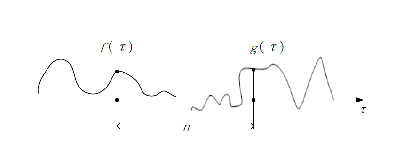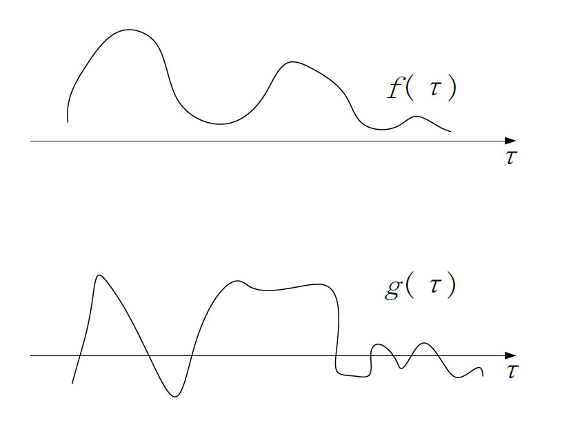 想象在一个一维直线(τ轴)上,有两个函数f和g,两个函数分别在某个线段(也可能是无限长)上代表了一系列的值,这个时候,两个函数的相对位置还没有确定,尚不能确定这两个函数的关系,这两者还不能知道是否处于重合、包含或者完全分离互不相关的位置,如图所示: